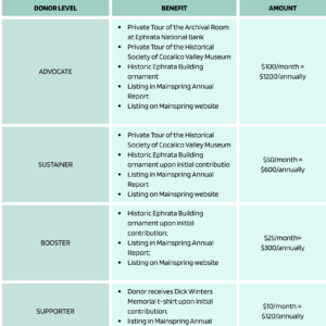 Support historic restoration efforts that protect Ephrata’s charm and attract future generations.